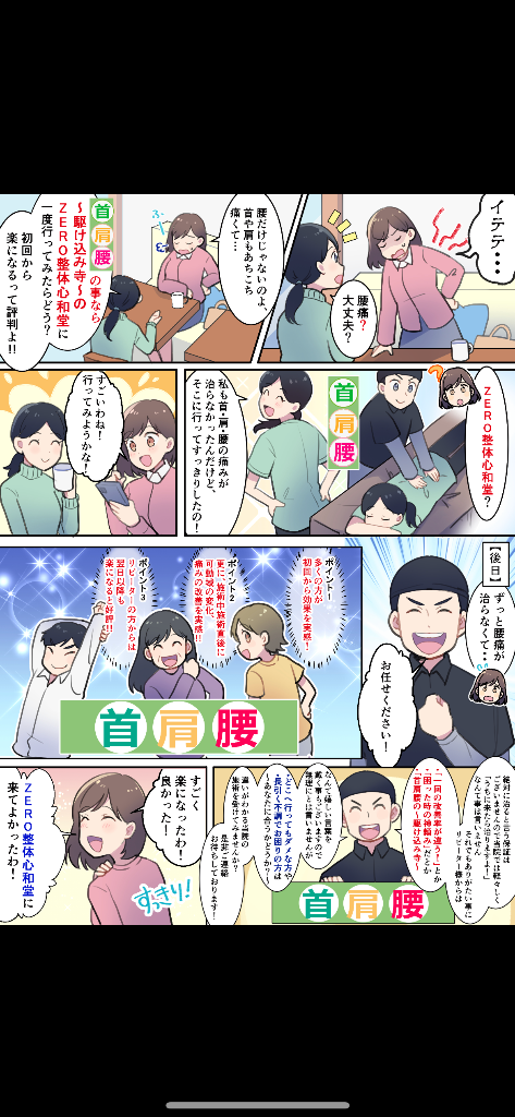 前回のマンガとは少し違いますが、こちらもこの春に先駆けて当院をイメージした広告チラシを作成しました❗️首肩腰の痛みや痺れでお悩み、お困りの方は、首肩腰の〜駆け込み寺〜ZERO整体 心和堂まで‼️😄😁😆