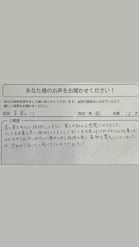 ⭕️首肩腰の痛みでお悩みの方に、初回施術後のクチコミ感想を頂きました。